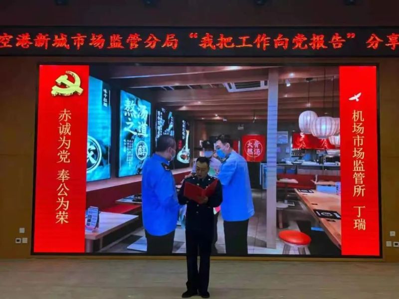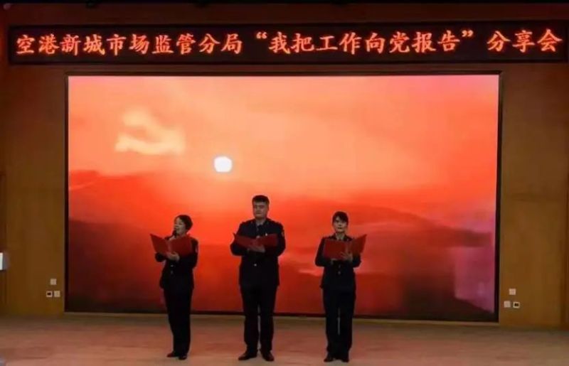 主題匯報在鏗鏘有力的入黨誓詞重溫中拉開帷幕。報告分“青春向黨、筑夢前行”“赤誠為黨、奉公為榮”兩大篇章,伴隨著視頻展播,來自分局基層黨建、疫情防控、競爭秩序監管、市場主體服務、價格監督、特種設備監察、食藥安全等戰線上的11名代表以“我把工作向黨報告”為主題,通過沉浸式講述,熱情謳歌黨的光輝業績,回顧空港新城市場監管分局大家庭日常工作的點點滴滴,在疫情阻擊、市場安全、執法辦案、服務民生中的默默付出和無私奉獻,踐行了在黨旗下的錚錚誓言。