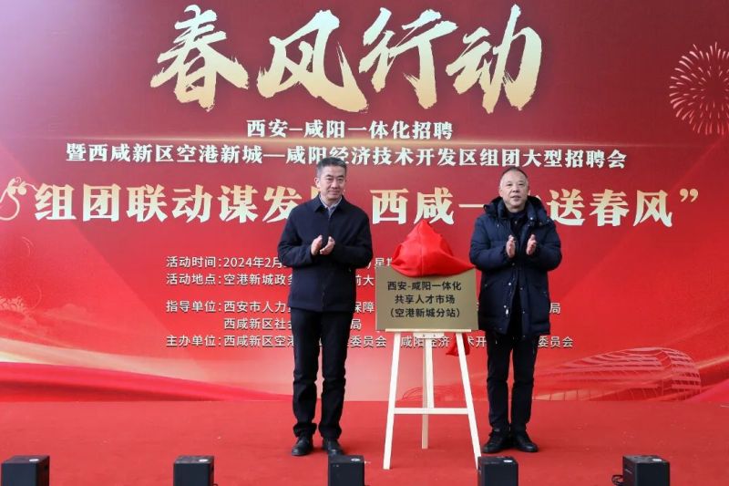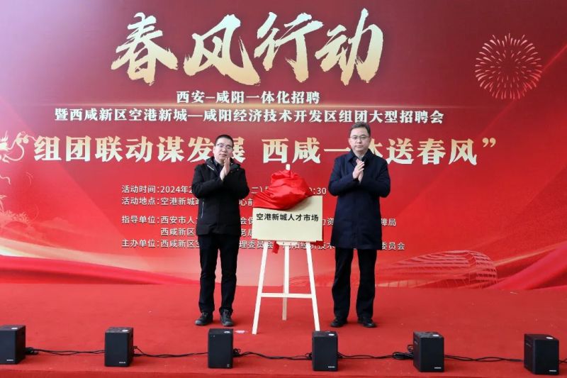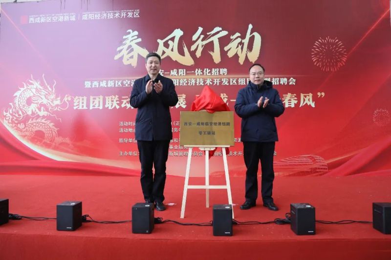 招聘會上,西咸新區社會事業服務局黨委書記、局長宋亞森和空港新城黨委副書記劉軍分別介紹了就業服務領域的建設情況、2023年舉辦招聘會和各類就業促進活動的開展情況以及本次“春風行動”活動的有關情況。隨后,與會嘉賓共同為西安—咸陽臨空經濟組團零工驛站、西安-咸陽一體化共享人才市場(空港新城分站)和空港新城人才市場揭牌并推動裝置正式啟動活動。