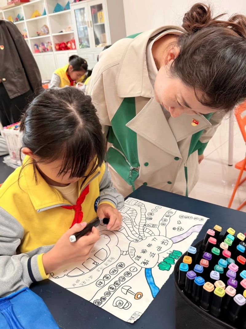 隨后的繪畫環(huán)節(jié),孩子們化身“低碳小設計師”,在畫紙上盡情描繪心中的綠色家園。有的孩子用彩色畫筆勾勒出新能源公交車行駛在綠樹成蔭的道路上的畫面;有的孩子畫出一家人在陽臺種植蔬菜的溫馨場景;還有的孩子通過對比畫面,展現(xiàn)了“污染環(huán)境”與“低碳生活”的不同景象。黨員干部們在教室里指導時,不時與孩子們交流創(chuàng)作思路,鼓勵他們將對低碳生活的理解融入作品中。