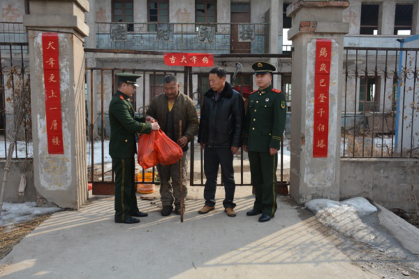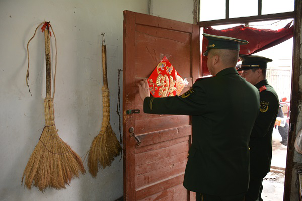 大隊官兵在到達貧苦戶家里后,首先帶來大隊全體官兵的親切問候,仔細詢問了貧困戶老楊的身體狀況,對他近期的醫療救助情況有了仔細的了解。老楊表示:最近病情有了明顯的好轉,身體也可以勉強做一些輕微的活動。這些都離不開空港新城全體官兵的幫助與支持。對老楊表示關懷后,大隊官兵立刻對老楊的住所進行了清理整潔,為老楊病情的恢復提供了一個干凈的環境。隨后對老楊大門、院內進行了對聯的張貼。