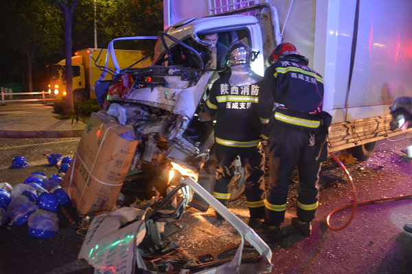 23時53分,空港新城中隊到達現場,指揮員立即下令,警戒組在事故現場周圍實施安全警戒,對事故現場進行全面封鎖,防止現場進入其他車輛發生二次事故。經偵查,發現事故車輛車頭因追尾碰撞嚴重變形,有一名被困人員,該被困人員雙腿膝關節以下被牢牢卡住,生命體征平穩,意識清晰。為了讓被困人員時刻保持清醒意識,指揮員對被困人員進行心理安撫。