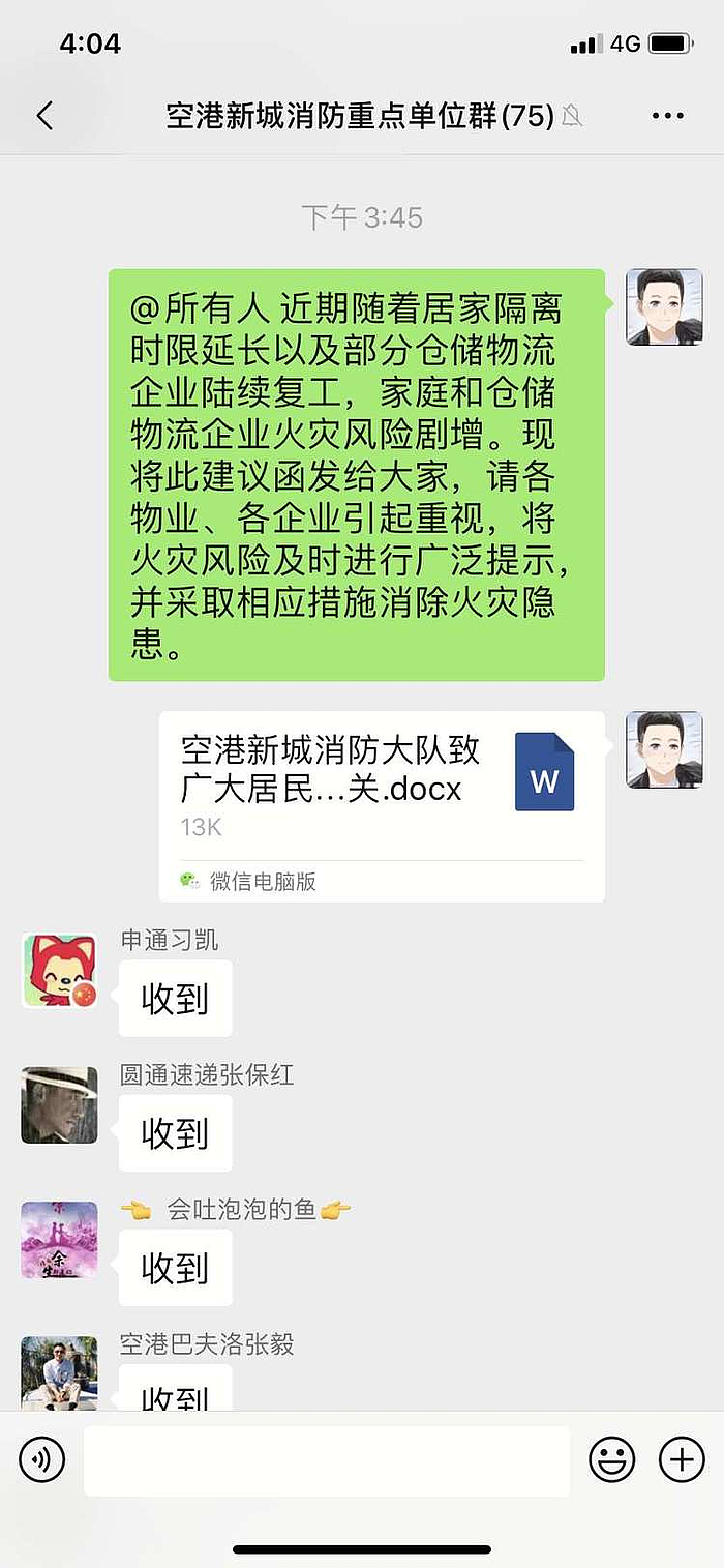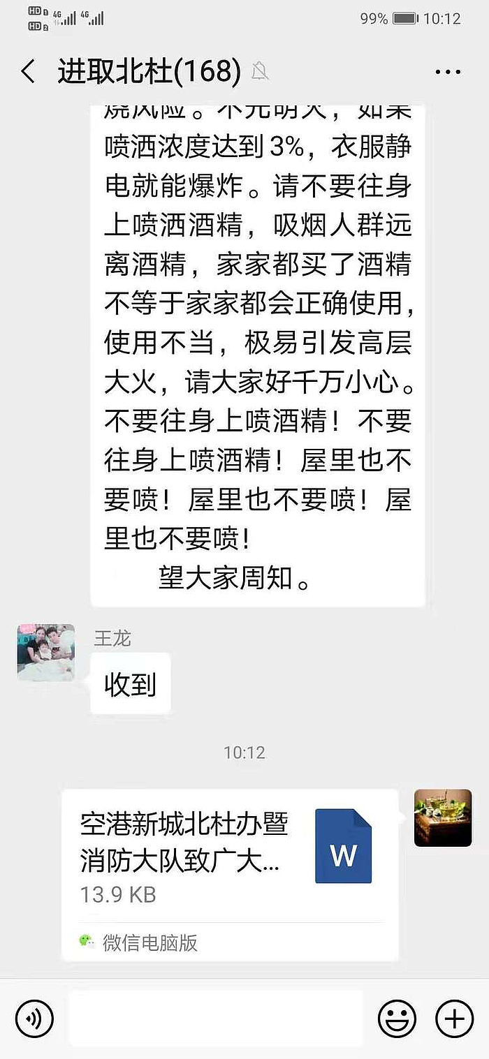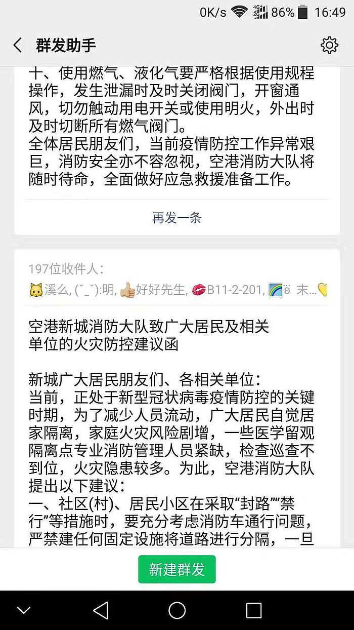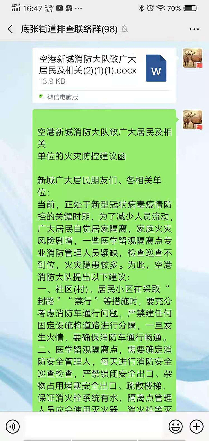 大隊結合新城實際,采取多種形式消防宣傳,一是向企業及物業下發《空港消防大隊致廣大居民及相關單位的火災防控建議函》,要求各單位全力做好消防工作,嚴格落實消防安全監管責任,有效預防火災事故的發生;二是加強網絡宣傳方式,通過微信群發集中提醒形式,向街辦及重點單位進行針對性消防提示、提醒,切實將消防宣傳提示傳達到相關責任人,全力助推疫情防控期間轄區消防安全;三是督促街辦及社區物業,利用樓宇led宣傳屏、居民微信群對廣大居民滾動發放消防安全提示,時刻提醒居民在防疫的同時不要疏忽消防安全的重要性。