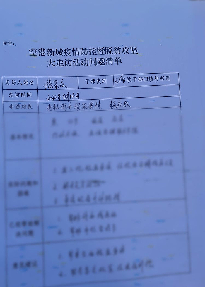 大隊扶貧干部首先向老人宣講了新冠病毒疫情防控基本知識,而后進行了仔細交談,詳細了解了老人最近的身體、生活狀況和目前存在的困難問題,根據要求填寫了《空港新城疫情防控脫貧攻堅大走訪活動問題清單》和精準扶貧工作的臺賬資料檔案。隨后扶貧干部叮囑老人要保重身體,做好疫情防控和防火災工作,大隊會一如既往地支持和幫助他,竭盡全力為他排憂解難。最后大隊與楊家寨村村干部就如何解決老人目前存在的實際困難進行了溝通交流,村干部表示會與大隊保持密切聯系,關心貧困對象實際問題,扎實做好精準扶貧工作,保證讓貧困對象從根子上脫貧。