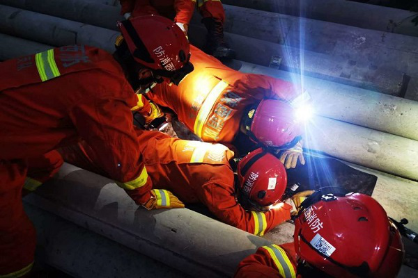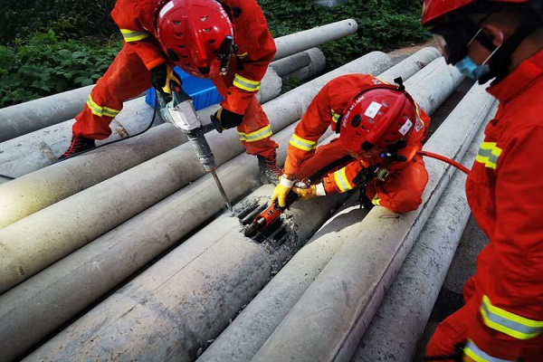 18時41分,兩名業務骨干利用沖擊鉆對水泥管口在管口14.1米處進行破拆,同時一名指戰員不斷清理碎石。19時20分,管壁已破拆開大約25公分的觀察口,指戰員通過觀察口確認被困孩童具體位置后,指戰員利用萬向鉗對觀察窗口處鋼筋進行剪切。19時32分,觀察窗口處鋼筋剪切完畢,指戰員利用上肢深入其中,輔助孩童嘗試進行脫困,經過摸索,孩童身體承胎兒姿態,兩膝與臀部被卡死與狹小的管道內,管道內存在凹凸不平的碎石凸面,若強行拖拉可能會造成骨折等二次傷害,且孩童被困時間長,下肢已經發麻,救援難度十分巨大。