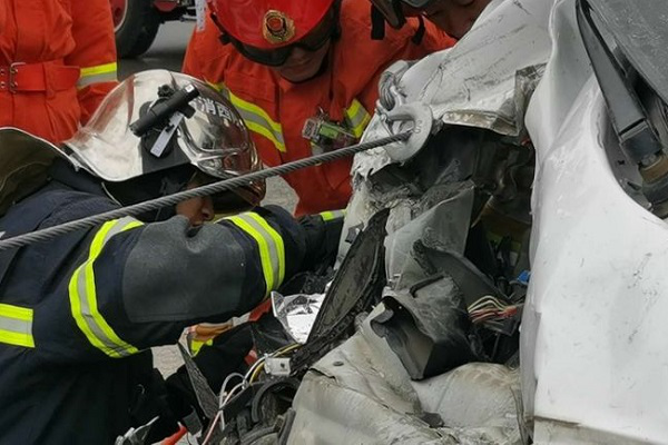 12時26分,指揮員結合現場實際制定營救方案,迅速組織城市主戰車牽引事故車輛前端,為被困人員擴充營救空間。12時32分,牽引工作實施完畢,救援站人員利用液壓破拆工具組對事故車輛副駕駛車門,車內擋板進行破拆。12時40分,救援站人員利用液壓頂桿、破拆器械、車體牽引不斷擴大營救空間,12時47分,營救空間全部打開,救援站人員在醫護人員的協助下,對一名被困人員進行搬運,隨后繼續對第二名被困人員進行施救,12時51分,救援站人員成功將第二名被困人員救出,并利用鏟式擔架對第二名被困人員進行搬運,移交120醫護人員。12時53分,救援站將現場移交高速交警部門后收整器材安全歸隊。