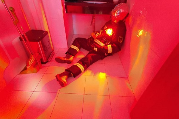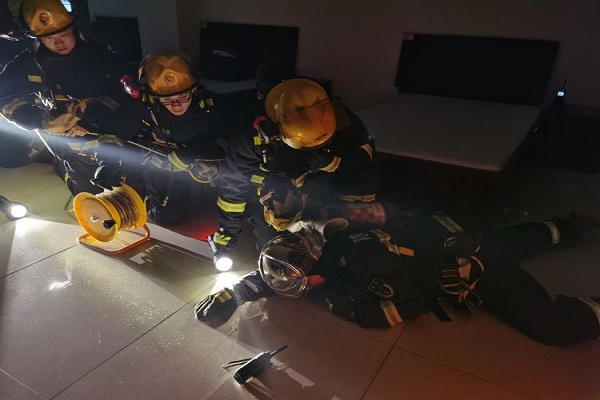 訓練前,熊冰濤站長首先講解滅火救援現場緊急救援小組的響應程序、人員分工及組成要素,強調了現場緊急救援的注意事項和實施要領。訓練過程假設內攻班組在行動過程中突遇建筑坍塌、迷失、失聯等情況,場外安全員發現失聯情況后第一時間啟動緊急救援小組響應指令,指派既定崗位人員成立緊急救援小組迅速開展救援。緊急救援小組人員攜帶手持電臺、紅外熱成像儀、強光照明燈、發光導向繩等十余件套裝備,通過沿水帶搜索與沿墻搜索等方式迅速確定被困人員具體位置,快速利用火場緊急救助技術分別對被困指戰員進行施救。