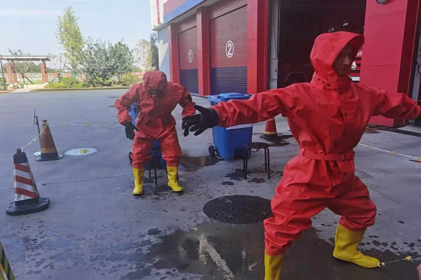 演練開始前,在設置消殺場地時,指揮員再次向全體指戰員細致講解了防疫消殺的重要性,強調了消殺流程的各處細節。隨后,全體指戰員穿戴好防疫裝備,嚴格按照行動流程開展演練。演練著重對初期警戒、區域劃分、建立洗消站、處置人員洗消、現場場地洗消開展作業。各消殺點利用高壓清洗機、過氧乙酸、75%酒精對指戰員防護服、衣物進行洗消,特別對指戰員腋下、胯部、足底等部位進行反復消殺。