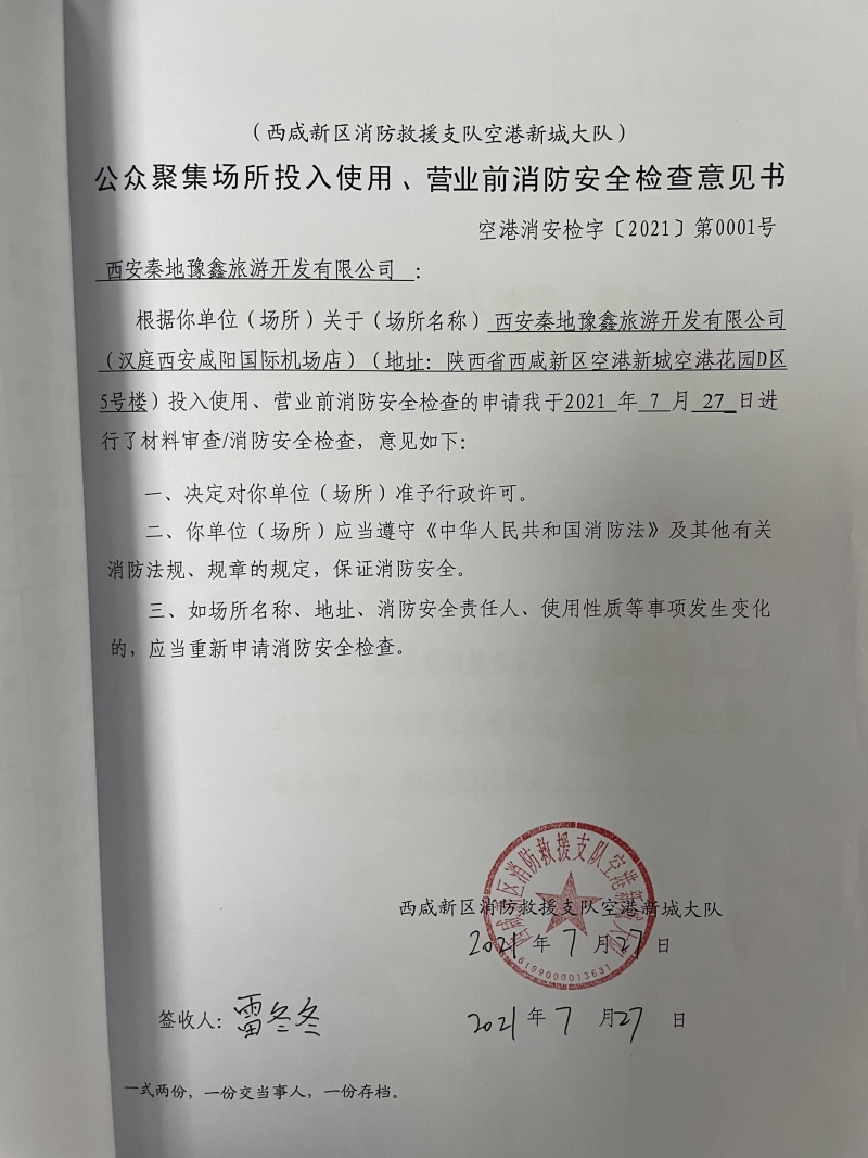 公眾聚集場所投入使用、營業前消防安全檢查意見書(西安秦地豫鑫旅游開發有限公司)