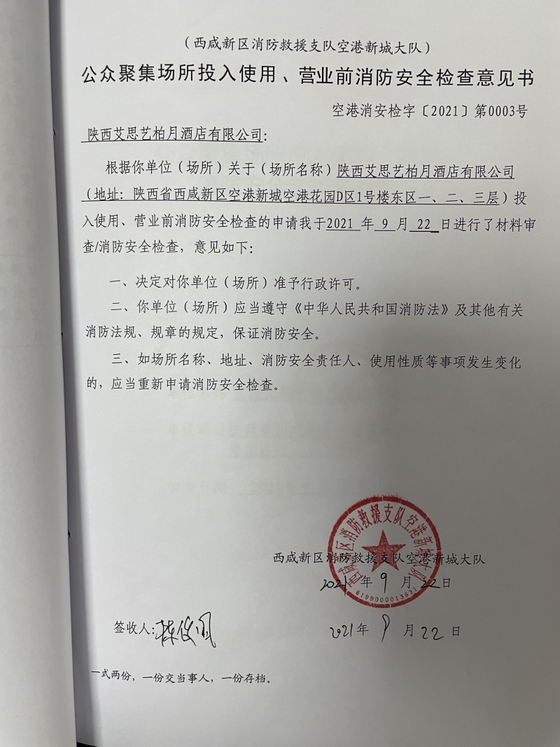 公眾聚集場所投入使用、營業前消防安全檢查意見書(陜西艾思藝柏月酒店有限公司)