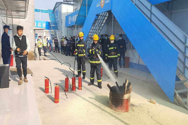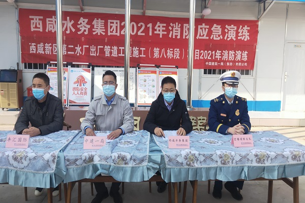期間,按照建設(shè)工地滅火應(yīng)急疏散預(yù)案,假設(shè)西咸水務(wù)集團項目部廚房煤氣泄漏發(fā)生火災(zāi),人員被困,施工現(xiàn)場安全人員發(fā)現(xiàn)后緊急報警,滅火組第一時間到場現(xiàn)場撲救火災(zāi),疏散組立即組織人員疏散,醫(yī)療組迅速展開救援,同時在永和路小型消防救援站隊員的共同配合下“大火”被撲滅,演練取得圓滿成功。