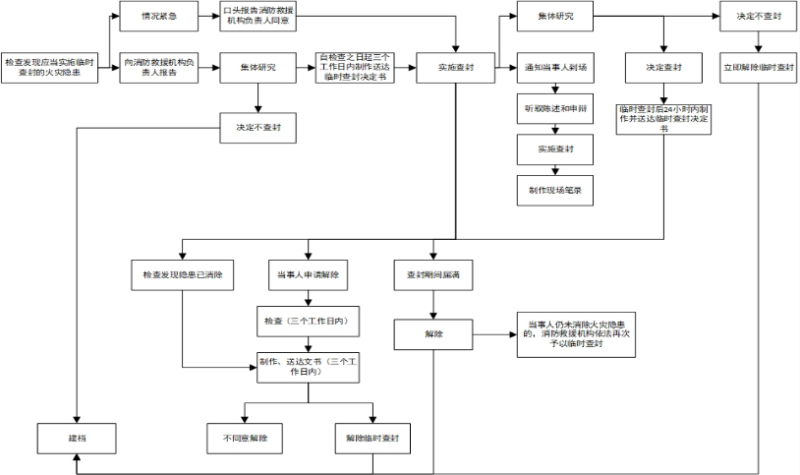 6.對檢查發現的火災隱患,依法督促整改、實施處罰,不及時消除隱患可能嚴重威脅公共安全的,依法依規對危險部位或場所采取臨時查封措施。