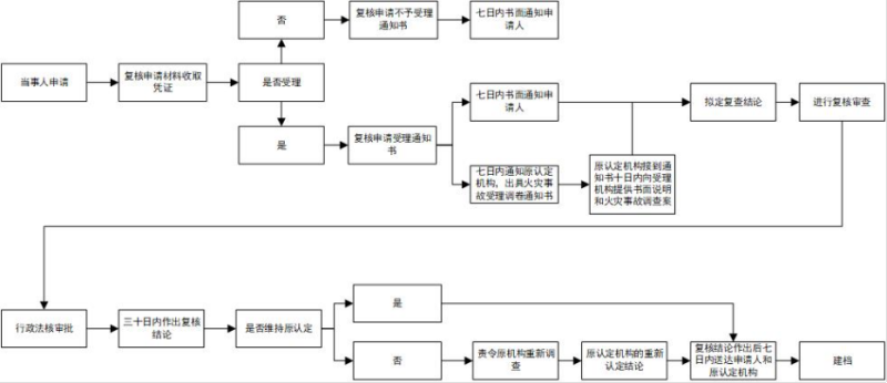 | 1 | 火災事故認定和復核 | 《中華人民共和國消防法》第五十一條 消防救援機構有權根據需要封閉火災現場,負責調查火災原因,統計火災損失。 火災撲滅后,發生火災的單位和相關人員應當按照機關消防救援機構的要求保護現場,接受事故調查,如實提供與火災有關的情況。 消防機構根據火災現場勘驗、調查情況和有關的檢驗、鑒定意見,及時制作火災事故認定書,作為處理火災事故的證據。 《火災事故調查規定》(公安部令第121號)第三十五條 當事人對火災事故認定有異議的,可以自火災事故認定書送達之日起十五日內,向上一級公安機關消防機構提出書面復核申請;對省級人民政府公安機關消防機構作出的火災事故認定有異議的,向省級人民政府公安機關提出書面復核申請。 復核申請應當載明申請人的基本情況,被申請人的名稱,復核請求,申請復核的主要事實、理由和證據,申請人的簽名或者蓋章,申請復核的日期。 | 消防救援大隊 | 行政復核 | |