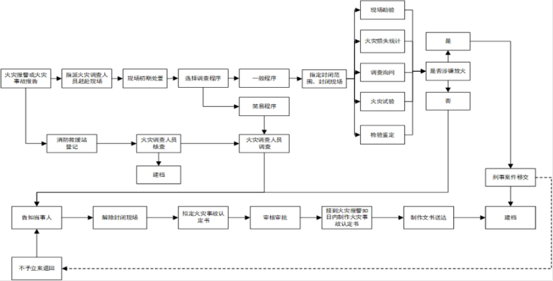 4、火災發生后及時趕赴火災現場,根據現場勘驗、調查詢問和有關檢驗、鑒定意見等調查情況,及時作出起火原因的認定。