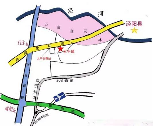 咸陽城區從迎賓大道直行進208省道至涇河橋北太平入口進入太平鎮,沿331鄉道(高太路)抵達太平鎮。