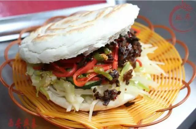 我只能說一個詞——量大!不過它不單量大,味道也極其好吃。軟軟的花干,鹵好的雞蛋,再加上一勺咸菜,一勺青辣椒圈,少許泡菜紅蘿卜,最后在蓋上一筷子酸辣土豆絲。這個夾饃就已經快到了爆裂的程度了!一定要記得用手將兩邊多按幾下,要不然如果不是姚晨,一般人的嘴是吃不下這個夾饃的!