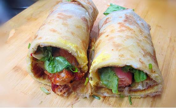 雞蛋灌餅內容豐富,雞蛋,火腿,里脊肉,生菜,各種漿汁,最后被一張在油鍋種煎炸的大餅所包裹!咬下一口,醬汁都將會從嘴角流出。再來一杯現磨的豆漿,加上少許糖,那少許殘留的豆渣混合著甜甜的豆漿,這才體會到了所謂的原汁原味。
