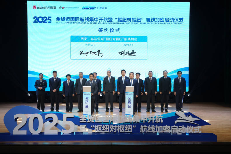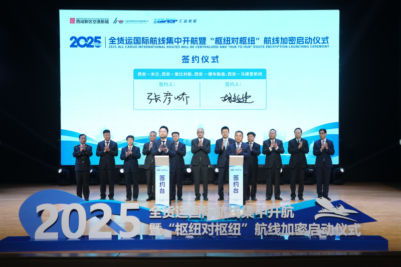 現(xiàn)場,空港新城與上海凌至國際貨運代理有限公司共同簽定西安-米蘭、西安-第比利斯、西安-德布勒森、西安-馬德里航線開通協(xié)議,與義烏迪比翼國際貨運代理有限公司共同簽定西安-布達佩斯“樞紐對樞紐”航線加密協(xié)議。