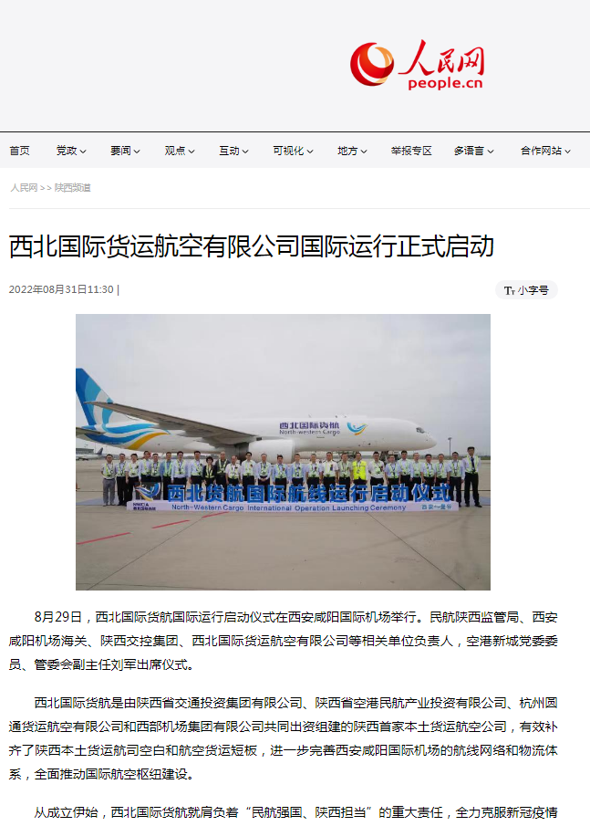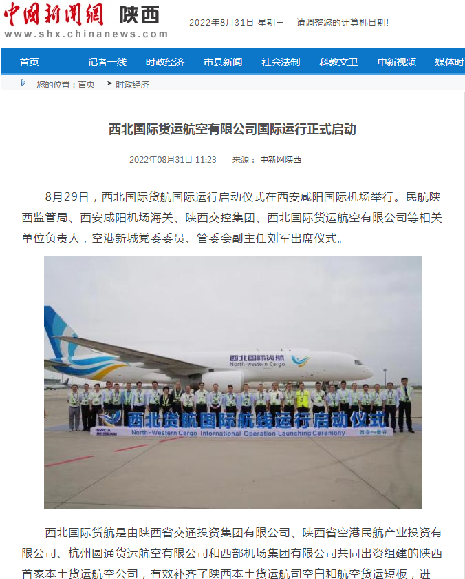 近日,人民網、新華網、中新網、央廣網、國際在線、中國報道網、陜西日報、陜西廣播電視臺、西安廣播電視臺等中央、省級、市級媒體,紛紛聚焦空港,全方位報道陜西首家本土貨運航空公司西北國際貨運航空有限公司國際航線成功首飛,開啟陜西全球貨運新篇章。