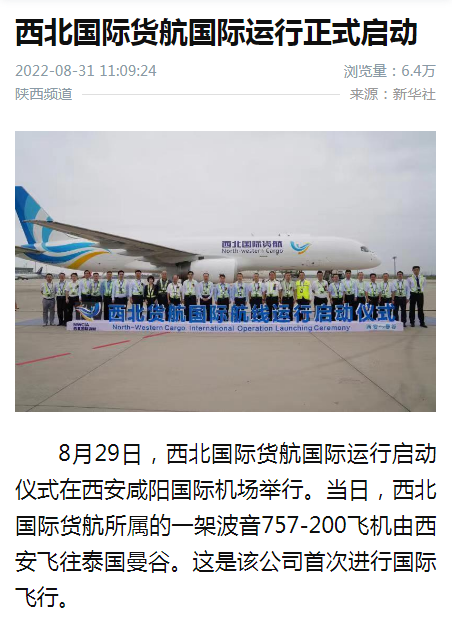 8月29日,西北國際貨航國際航線運行啟動儀式在西安咸陽國際機場舉行。當日,西北國際貨運航空有限公司(以下簡稱“西北國際貨航” )所屬的一架波音757-200飛機由西安飛往泰國曼谷。這是該公司首次進行國際飛行。