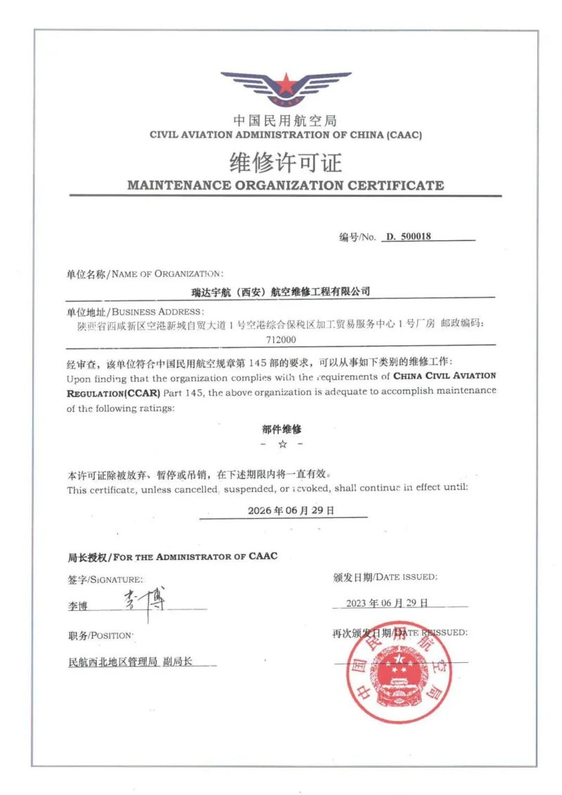 7月19日,空港區(qū)內(nèi)企業(yè)瑞達(dá)宇航(西安)航空維修工程有限公司(以下簡稱:瑞達(dá)宇航)正式獲得由中國民用航空西北地區(qū)管理局頒發(fā)的CCAR-145維修許可證,成為西北地區(qū)首家獨立航空復(fù)合材料深度維修企業(yè)。
