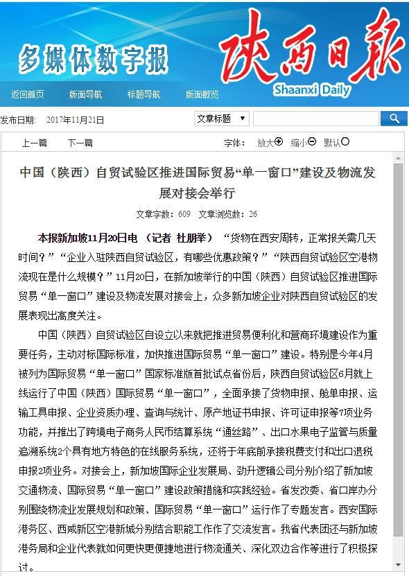 11月20日,陜西省政府商務(wù)代表團赴新加坡舉辦中國(陜西)自由貿(mào)易試驗區(qū)推介活動。本次活動除召開推介大會外,還組織了金融創(chuàng)新、推進國際貿(mào)易“單一窗口”建設(shè)及物流發(fā)展兩個對接會。空港新城黨委委員、管委會副主任艾晨帶隊參加活動,并向新加坡政府部門和企業(yè)介紹了空港新城。