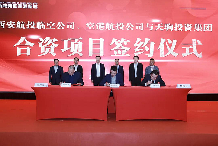 11月20日,西安航投臨空產業發展有限責任公司、陜西省空港民航產業投資有限公司與陜西天駒投資集團有限公司(以下簡稱:西安航投臨空公司、空港航投公司、天駒集團)合資項目進行簽約,將共同開發位于西咸新區空港新城面積約117畝的商務金融用地,支持幸福航空總部基地落戶西安。