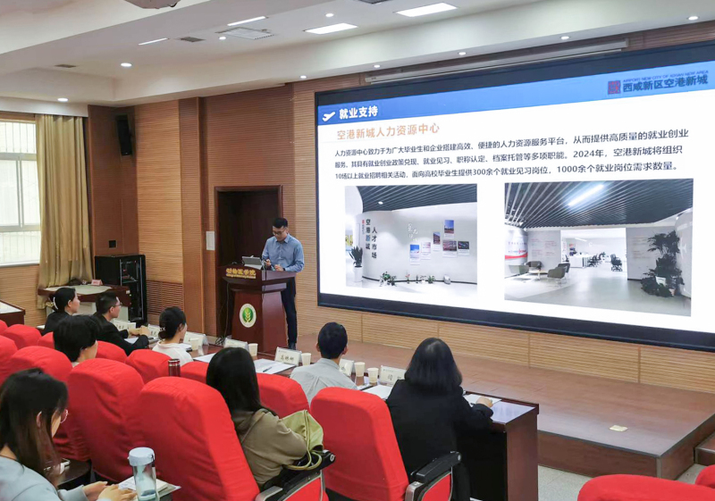 活動現場,西咸新區人力資源服務中心、空港新城組織人力部相關領導分別就西咸就業服務有關工作、空港新城的企業情況為企業和高校做了詳細的介紹,陜西梅里眾誠動物保健有限公司招聘經理、西咸新區國睿一諾藥物安全評價研究有限公司人事經理也依次就企業的特色優勢、產出水平、發展前景、科技實力做了詳細地講解?,F場氣氛活躍,校企雙方及學生代表積極討論,紛紛向企業詳細了解工作環境、職業發展等情況。此外,空港新城組織人力部工作人員向校方及學生代表宣介西咸新區、空港新城招聘信息線上發布渠道,為畢業生提供更多就業方向和就業選擇。