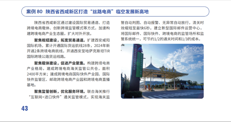 以空港新城為主要承載區(qū)的“陜西省西咸新區(qū)打造‘絲路電商’臨空發(fā)展新高地”案例被收錄于《案例集》的第七部分——“政府引導(dǎo)/加強(qiáng)制度創(chuàng)新,促進(jìn)協(xié)同發(fā)展”,標(biāo)志著空港新城7年來的跨境電商綜試區(qū)創(chuàng)新示范先行區(qū)建設(shè)成果獲得權(quán)威認(rèn)可。
