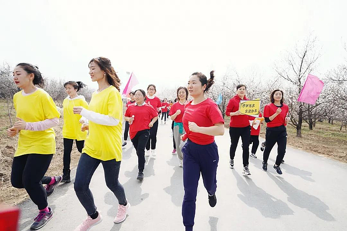 “跟著我,原地踏步走”“one、two、three,向前四步走......”,3月5日,風和日麗,開滿杏花的空港新城太平鎮涇河灣熱鬧異常,伴隨歡快的節奏,參加空港新城“凝聚巾幗力量 跑出活力空港”歡樂跑活動的200余名杰出女性代表,正在老師的帶領下做跑步前的準備活動