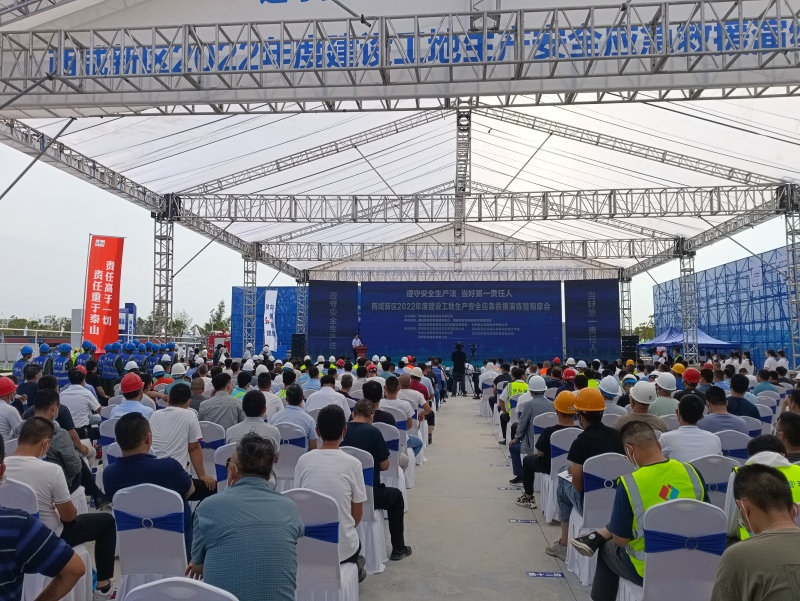 活動現場,參會人員共同觀看了《建筑施工領域安全生產警示宣傳片》,陜建機場三期擴建配套工程作為項目代表做了經驗交流,新區住建局質安站副站長陳雅斌宣布西咸新區2022年度建筑工地生產安全應急救援演練正式開始。