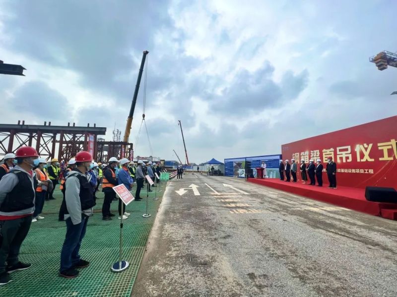本項目鋼結構橋梁總用鋼量約1.7萬噸,設計復雜且施工難度大,是橋梁工程建設過程中的控制性節點。此次鋼箱梁首吊,不僅是高架橋梁工程建設的里程碑,更是T5站前商務區綜合交通系統形成的最為關鍵的工序之一。