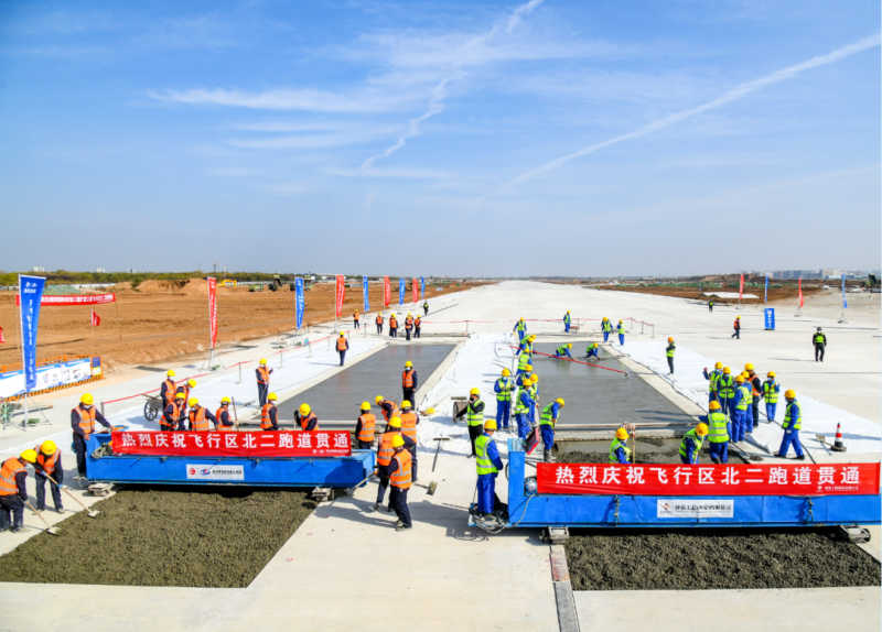 據悉,北二跑道于2021年3月開始土方與地基處理工程施工,面對疫情影響、持續高溫、暴雨洪澇等重重困難疊加的復雜局面,全體建設者辛勤付出、大干快上,高峰時期每日投入作業人員1200余人、施工器械200余臺,采用3D打印毫米級攤鋪技術,確保了工程高效有序推進,如期完成任務。