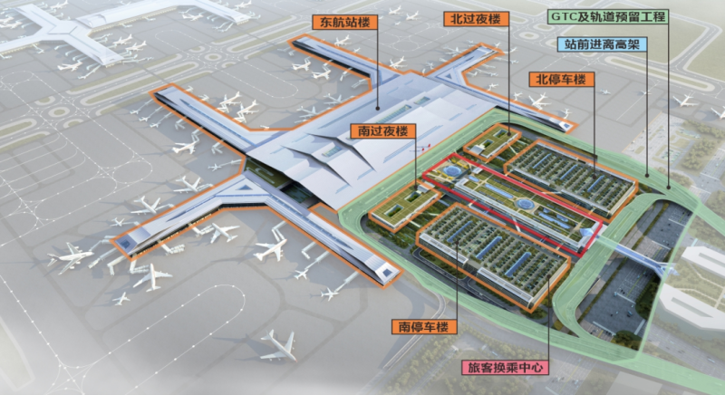 目前,進出場高架橋、復合立交、地下環隧、地面道路等已完成總工程量的50%,凌云國際、航投大廈等項目已建成投運,凱悅酒店、機場信息中心、商業綜合體、科技人才成果轉化中心等項目正在加速建設。T5站前商務區計劃與T5航站樓同步投用,打造集高端商務配套、城市風貌展示、絲路人文交流于一體的“世界航空都市之眼”“國家中心城市地標”。