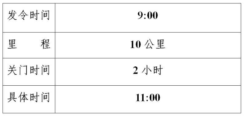 注:為確保參賽運動員比賽安全、順利,比賽期間路線各段設置關門時間,限時對社會交通封閉。參賽者未在規定的關門時間跑完,請立即停止比賽,退出賽道,以免發生危險。退出比賽者可乘坐組委會提供的收容車到相應項目的終點處。