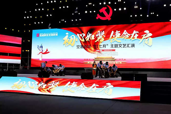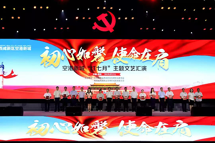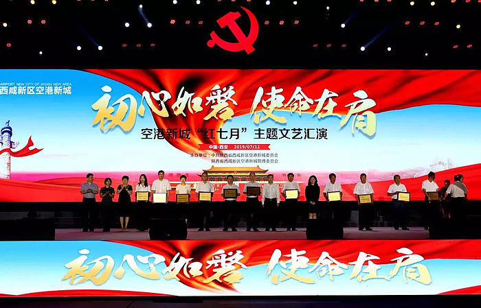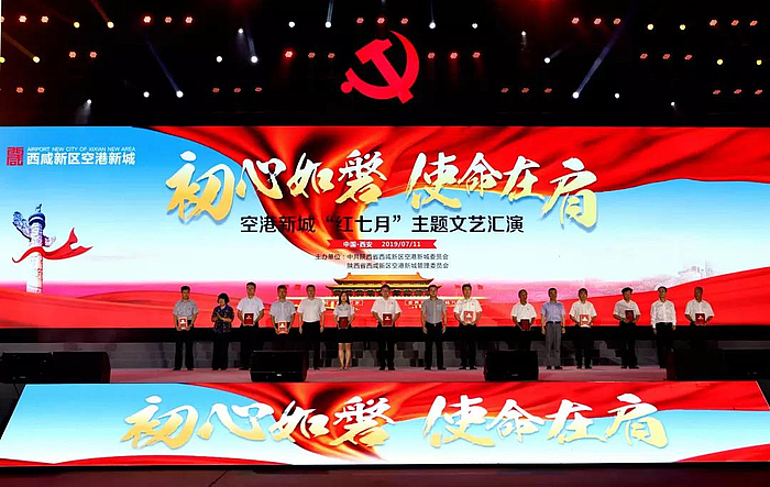 7月11日晚8時,空港新城“初心如磐,使命在肩”紅七月主題文藝匯演在陜西西咸保稅物流中心卡口盛大開幕,渭城區政府副區長成小曼,渭城檢察院檢察長王平信,渭城法院院長蘇俊,渭城區委宣傳部常務副部長陳二庫;涇陽縣縣委常委、統戰部長蔣蘋,副縣長劉洋,民航陜西監管局黨委副書記、紀委書記楊宏濤,西安咸陽機場海關關長李晉生,西北空管局投資拓展經理張凱,西部機場集團工會主席湯曉峰,西安咸陽機場紀委書記魏彩會受邀參加,空港新城黨委、管委會、集團公司領導班子成員出席。同時,這場空港新城自編自導自演的晚會還特別邀請長期以來默默付出支持空港建設的員工家屬和轄區企業家以及社會各界人士近兩千人到場觀看演出。