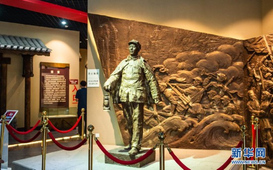這是在茍壩會議陳列館拍攝的毛澤東身披外套、提著馬燈疾行的雕塑(2019年7月5日攝)。