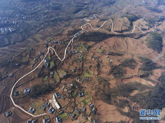 這是四川省涼山彝族自治州美姑縣四峨吉村約6公里的道路硬化項目(2017年2月12日攝,無人機照片)。