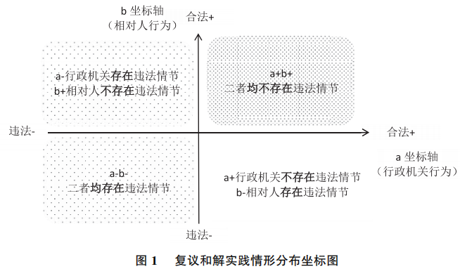 但“糾錯型和解”顯然只是其中一種,不能代表和解的“理想類型”。如圖所示,和解在第一象限(a+b+)一般不會出現,而在第二象限(a-b+)和第三象限(a-b-)中,行政機關往往因認識到自身確存在違法才選擇和解。對于第四象限的情形,相對人確有錯誤,而行政機關沒有明顯違法情節的情況下,很少適用和解。是以,實踐中的行政復議和解制度并未完全激活,相對人在和解中的主動性地位被淡化,缺失基于“意定”的中間層次。