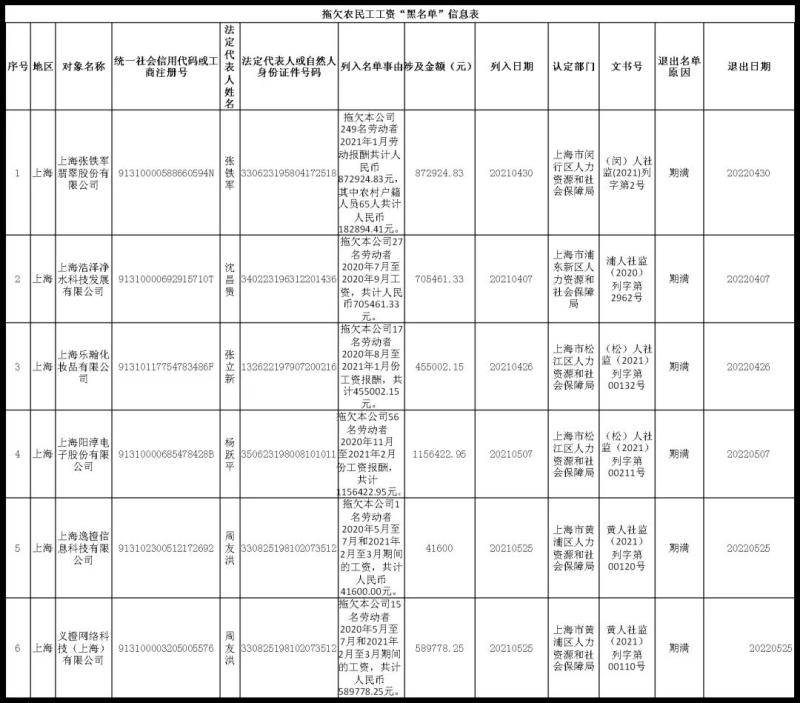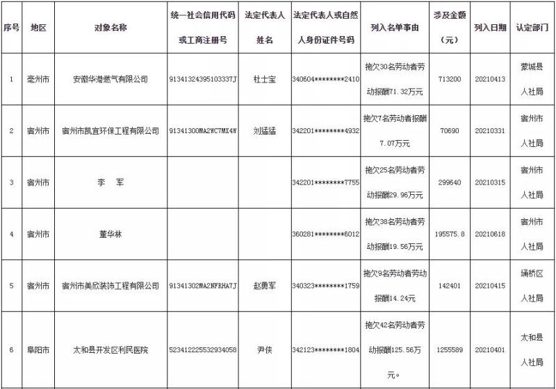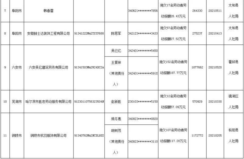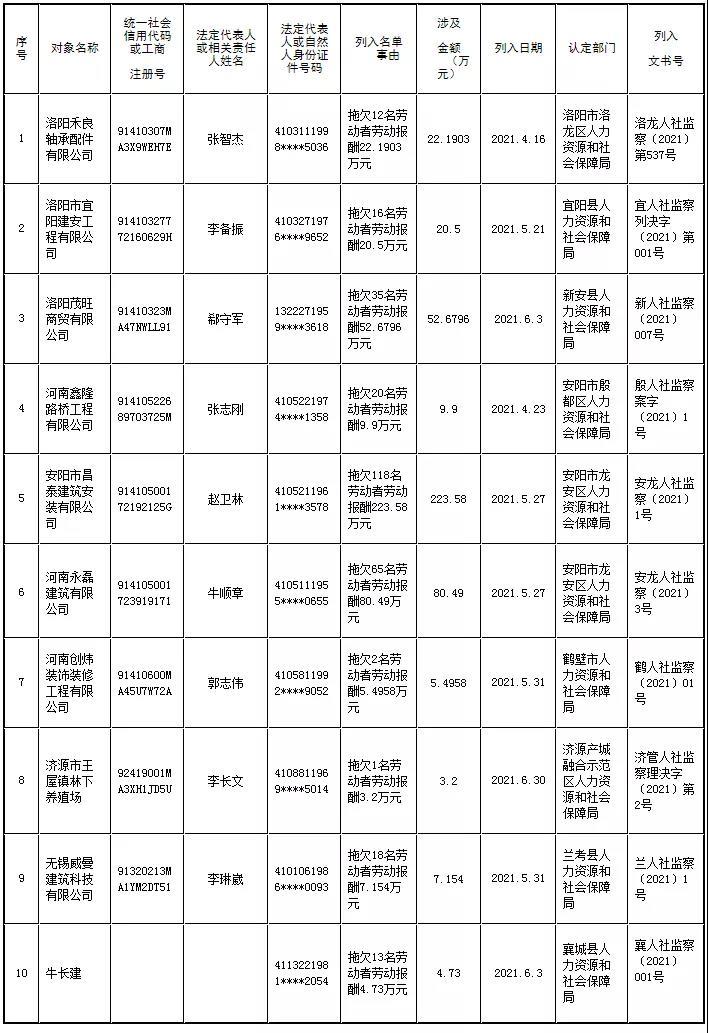 為警示和震懾勞動(dòng)保障違法行為,加強(qiáng)對(duì)拖欠工資違法失信行為的懲戒,進(jìn)一步維護(hù)勞動(dòng)者合法權(quán)益,根據(jù)《拖欠農(nóng)民工工資“黑名單”管理暫行辦法》(人社部規(guī)〔2017〕16號(hào)),現(xiàn)公布2021年第二批拖欠農(nóng)民工工資“黑名單”。具體名單如下: