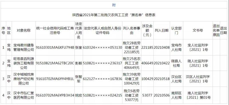 根據(jù)《保障農(nóng)民工工資支付條例》《拖欠農(nóng)民工工資“黑名單”管理暫行辦法》《陜西省違法失信“黑名單”信息共享和聯(lián)合懲戒辦法》等規(guī)定,近日,陜西省人力資源和社會(huì)保障廳公示2021年第二批拖欠農(nóng)民工工資 “黑名單”。