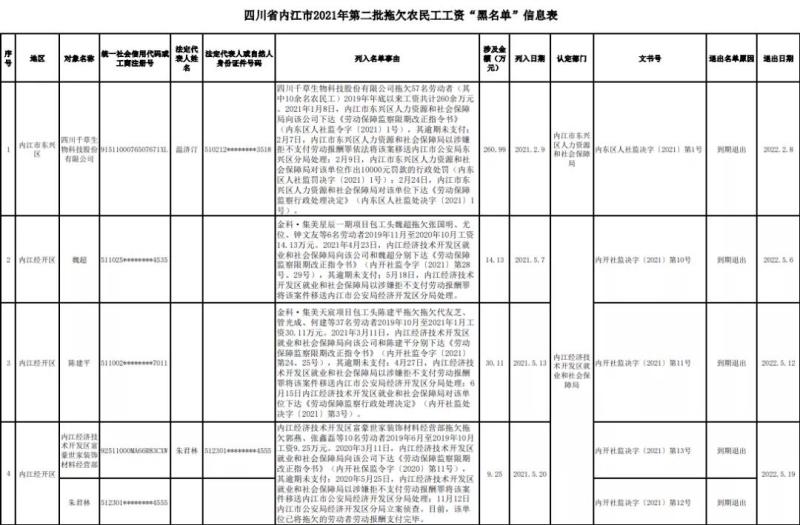 近日,內(nèi)江市人力資源和社會(huì)保障局公布了《四川省內(nèi)江市2021年第二批拖欠農(nóng)民工工資“黑名單”信息表》,信息表中展示了拖欠對(duì)象名稱、統(tǒng)一社會(huì)信用代碼或工商注冊(cè)號(hào)、法定代表人或自然人身份證件號(hào)碼、列入名單事由、涉及金額等多項(xiàng)內(nèi)容。