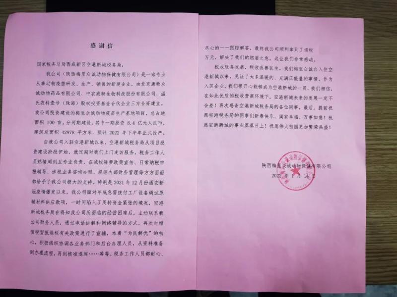 “我們梅里眾誠入駐空港以來,見證了太多溫暖的、充滿正能量的事情,作為入區企業,我們很開心能夠成為空港新城的一員,我們相信,在如此優質的稅收營商環境下,空港新城未來的發展一定不會差!再次感謝空港新城稅務局的各位同志。”1月17日,空港新城稅務局收到了一封來自陜西梅里眾誠動物保健有限公司(以下簡稱“梅里眾誠”)的感謝信。