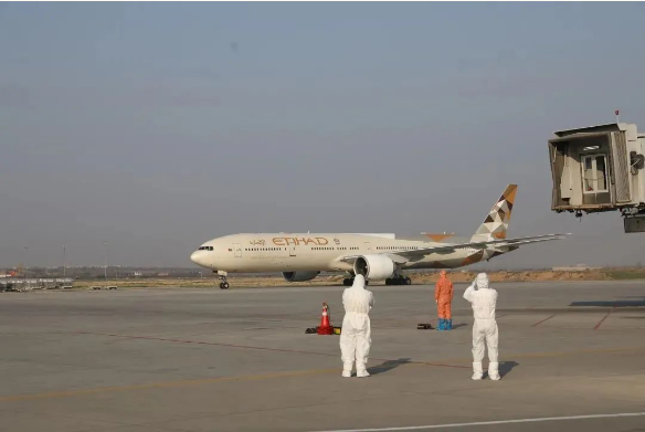 在大家的不懈努力下,2020年3月23日,由阿提哈德航空公司執飛的EY888航班從阿布扎比飛抵西安,機上的31名機組人員和382名旅客在防疫人員的引領下,順利下機檢疫通關。