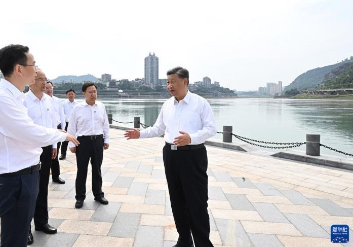 6月8日,中共中央總書(shū)記、國(guó)家主席、中央軍委主席習(xí)近平在四川考察。這是8日下午,習(xí)近平在宜賓市三江口考察,聽(tīng)取當(dāng)?shù)赝七M(jìn)長(zhǎng)江流域生態(tài)修復(fù)保護(hù)等情況匯報(bào)。新華社記者 李學(xué)仁 攝