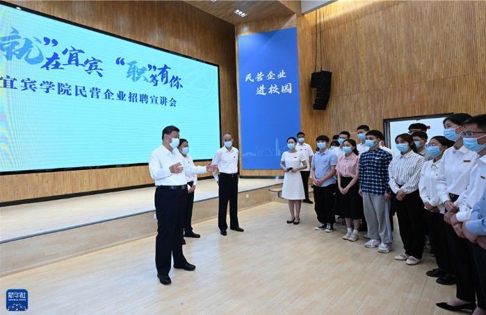 6月8日,中共中央總書(shū)記、國(guó)家主席、中央軍委主席習(xí)近平在四川考察。這是8日下午,習(xí)近平在宜賓學(xué)院考察時(shí),向正在參加企業(yè)招聘宣講會(huì)的教師、學(xué)生、企業(yè)負(fù)責(zé)人了解企業(yè)招工需求和畢業(yè)生簽約率等情況。新華社記者 李學(xué)仁 攝