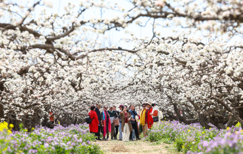 2025年4月5日,游客在河北省晉州市周家莊鄉第九生產隊梨園內踏青賞花。新華社發(梁子棟 攝)