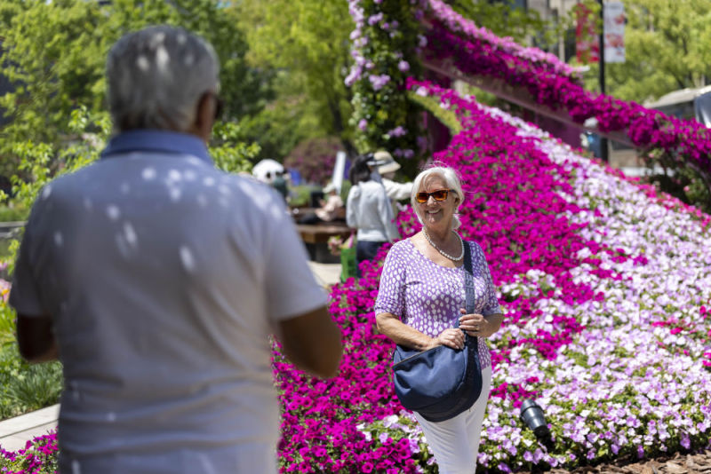 4月18日,外國游客在上海國際花展黃浦新天地主會場留影。新華社記者王翔 攝