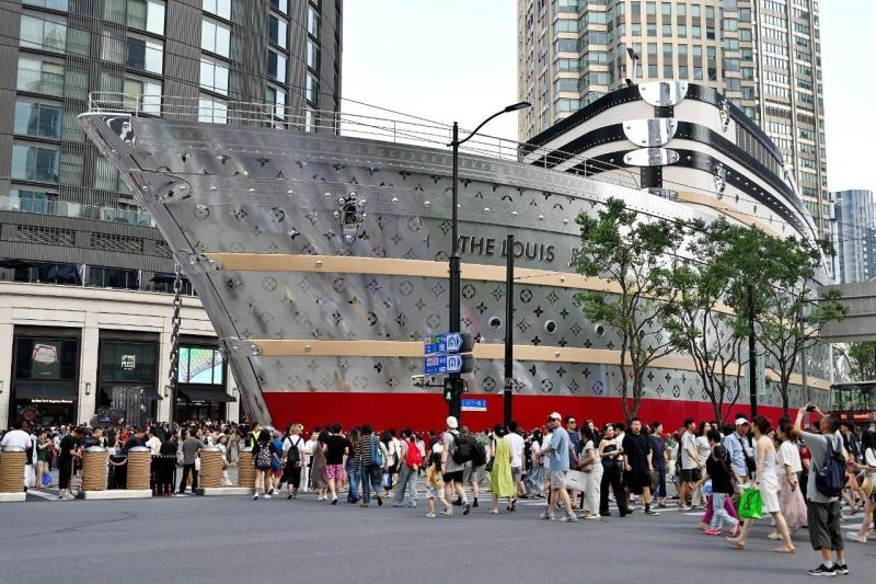 而不久前,上海靜安興業太古匯門前,一艘高30米、長114.5米的“巨輪”——“路易號”揭開神秘面紗。紅銀相間的船身,以經典LV(路易威登)旅行箱疊加堆砌而成,巨型鎖扣與鉚釘的金屬質感不僅延續了品牌深厚的歷史基因,也映襯出上海這座城市的海港氣質。