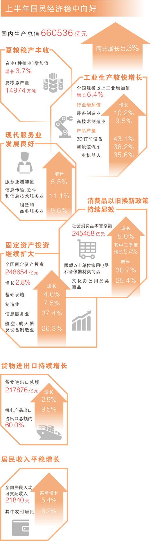 國內生產總值(GDP)增長穩中有升。初步核算,上半年GDP為660536億元,同比增長5.3%,比去年同期和去年全年均提升0.3個百分點。