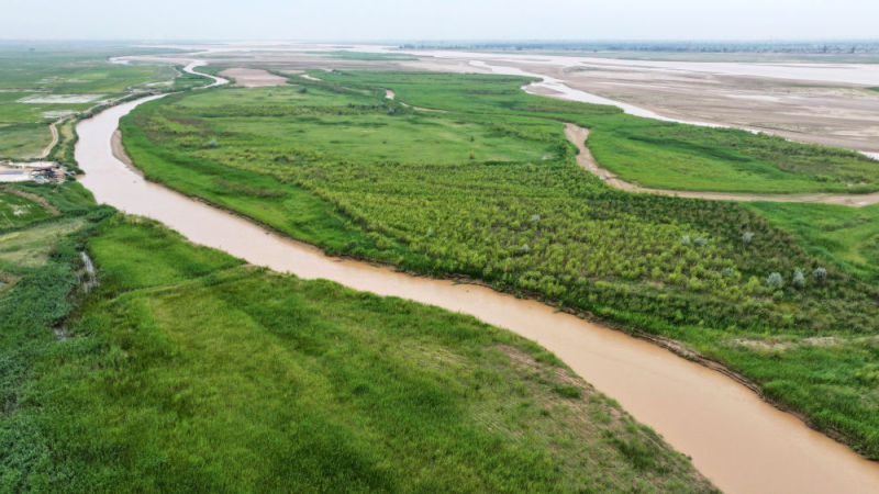 這是2025年6月22日在寧夏平羅縣境內拍攝的黃河灘涂濕地(無人機照片)。新華社記者 王鵬 攝